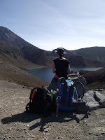 On our final morning we were greeted with the sight of the frost shimmering in the dawn light, a good omen for the day ahead. We headed off across the tussock and shrub land and were making good time so decided to take a side trip up to the Lower and Upper Tama Lakes. It was certainly well worth doing the detour, and although the wind on the ridges was pretty fierce, the view from the top was absolutely spectacular. We then headed back down and followed the winding path over to Taranaki Falls, a very impressive and awe-inspiring waterfall. From there it wasn't too far back to the village of Whakapapa, spurred on by the thought of some proper food after a few days of packet soup and instant noodles. When we arrived in the village we quickly realised we'd stayed there before, back in our gap year trip of 2004, when we'd first learnt to snowboard on the slopes of Mt Tongariro. We found ourselves a cafe and toasted our success with toasties and soup. Bliss!