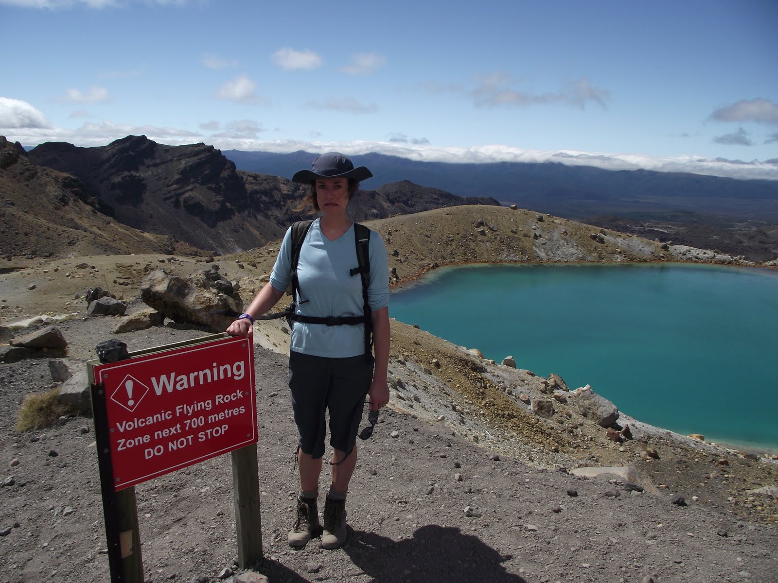 We were making good time and so took a detour to climb to the top of Mt Tongariro, for even better views of Mt Ngauruhoe. It was at this point that we could hear some rather loud and rather ominous booming. Not many people were on this path, so it was a little unnerving after reading all the warning signs about the possibility of eruptions! After consulting the DOC leaflet and ascertaining that we couldn't smell any noxious gasses so it was probably fine, we continued on our way. Once at the summit, we were rewarded with yet more imposing views of Mt Doom moodily blanketed in cloud, before heading back to the Red Crater and descending steeply down to the Emerald Lakes. It was gravelly enough for your feet to sink in and steep enough for you to be able to almost run/ski down. It was certainly more fun going down than it looked coming back up as some of the more intrepid day-trippers were doing. The Emerald Lakes at the bottom were absolutely stunning and we spent some time taking photographs and soaking up the scenery, before pressing on to avoid hanging around in the volcanic activity area for too long! From there the day trippers were forced to turn back (the normal route is still closed due to the recent eruptions). Due to starting the trip early, it had only been busy when we had returned from the deviation to Mt Tongariro, but past this point there appeared to be very few people walking the full circuit and we began to feel much more that we were in the middle of nowhere (in a good way). The last stretch over the Oturere Valley was a fairly desolate landscape shaped by lava flows. By this point we had been walking a good 6 hours on what turned out to be a beautiful summer's day, and with our heavy bags we were starting to tire. Around every corner we were convinced that the hut we were aiming for must be 'just around the next corner', and thankfully it eventually was!
