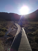 We got up at the crack of dawn the next day to catch the 6am shuttle bus into the National Park. Bleary eyed we watching wound our way in the park with the imposing Mt Ngauruhoe (aka Mt Doom) coming into view, fittingly accompanied by the soundtrack to Lord of the Rings. We stepped off the bus not long after the sun had started to rise and headed off into the cool crisp air. Most of the people on our bus were doing the day walk, so we felt a little smug to be able to maintain a good pace despite having the extra burden of sleeping bags and 3 days worth of clothes and food on our backs. We had been going for less than an hour when we reached Soda Springs, a teeny trickle of a waterfall surrounded by wild flowers. At this point we zipped past a bunch of 18 year old girls who had already cracked open the chocolate and energy drinks, who looked just about ready to give up already, and this was before we'd even started on the Devil's Staircase. We had heard horror stories of huge bottlenecks at this this section as it is, as the name suggest, a set of narrow and relentless steps, but as it was still early there weren't too many people around just yet, and we were able to go at our own pace. It was certainly a good thing that we were doing this in any heat, as the sun was still to hit us directly as it rose behind the mountains. At the top we were rewarded with a view across the South Crater, and our first experience of the lunar landscape. After crossing the Crater we then climbed once more, towards the Red Crater with some fantastic old 'blow holes' from previous volcanic activity.